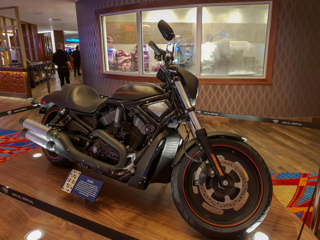 Wie in den HRC so üblich steht und hängt dann auch überall so Zeugs von bekannten Künstler rum. Beispielsweise die Harley von Slash.
